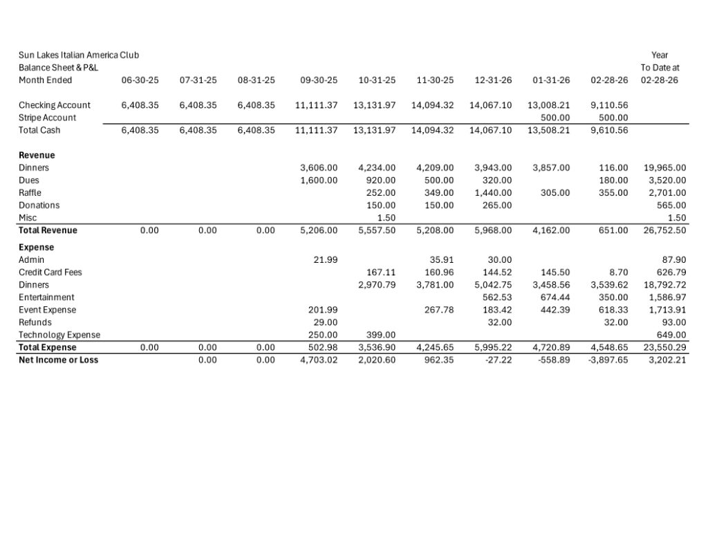Sun Lakes Italian American Club – Treasury Report